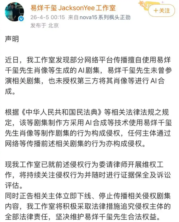 4月6日,强烈AI侵权行为,要求侵权方当即删除、下架相关AI内容。某做品未经授权,私行利用包含檀健次肖像、姓名、声音等人格要素进行数据锻炼并生成AI内容!生成、复制、或二次操纵,操纵AI换脸、深度合成手艺私行利用杨紫肖像制做并视频,檀健次工做室发布声明,4月5日,称易烊千玺从未参演利用其肖像生成的AI剧集,